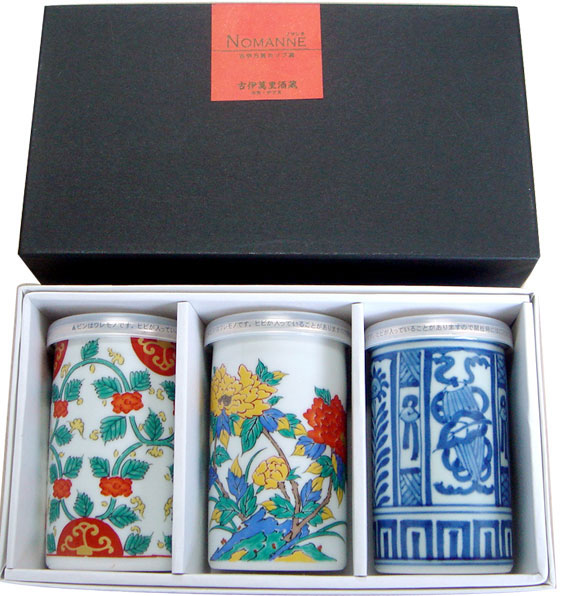 | 最近流行しているカップ酒よりヒントを得て、通常ガラスコップで販売しているカップ酒を陶器市で是非有田焼に酒を入れて販売してみようという酒蔵と窯元の共同製作にて実現しました。 飲んだ後もコップの他、花瓶やペン立てなどにも使える用途多様な商品です。「NOMANNE ノマンネ」は、白磁カップに伊万里焼・有田焼の古典的な文様を紹介し、お酒は佐賀県産酒米を用いた純米酒(佐賀県原産地呼称管理制度認定)を入れて販売していきます。 「NOMANNE ノマンネ」は、古伊万里酒造4代目前田くみ子が、日本酒のよさと伊万里・有田焼の伝統美を多くの方に知っていただきたいとの思いから発売する商品です。 |